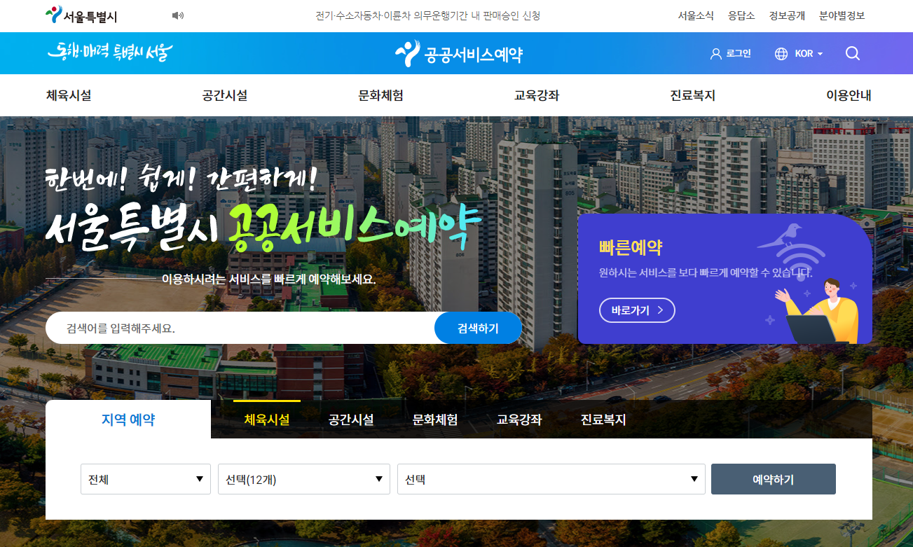 서울시에서 직영 또는 위탁운영 중인 체육시설, 공간시설, 문화체험, 교육강좌 등 매우 유용한 정보를 얻어가실 수 있습니다.